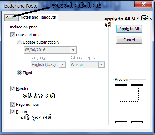 હેડર અને ફુટર ઉમેરી શકાય છે.વધુ માહીતી માટે જુઓ નીચેનુ ચિત્ર