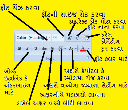 ચેંઝ કરવા ફોંટ બોલ્ડ,ઇટાલિક,અંડરલાઇન તેમજ ફોંટ કલર તેમજ ફોર્મેટીંગ દુર કરવા અક્ષર પડછાયો ઉમેરવા અક્ષરો વચ્ચે